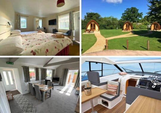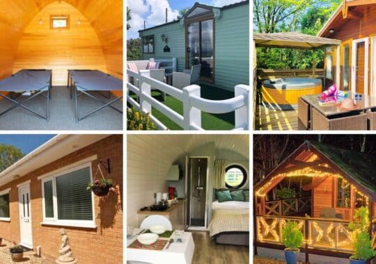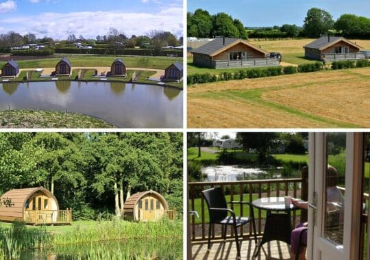 Top photo Row 1: Self-catering bungalow at Parkland, Devon; Dog friendly shepherd hut at Back of Beyond, Dorset; Pods at Run Cottage, Suffolk; Glamp and fish at Grooby’s Pit, Lincolnshire.