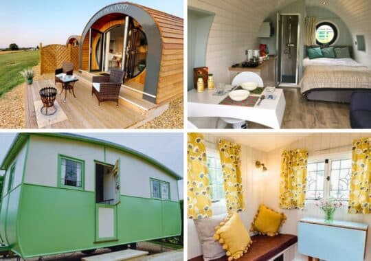 - Basic glamping – camping pods, cabins, yurts, shepherd huts or single-room structures without ensuite toilets, so you need to use the park’s facilities. Some units provide camping-style cooking equipment and kettles.