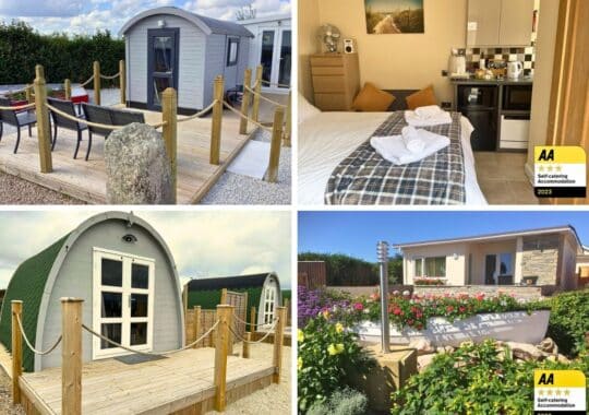 - Holiday lodges, static caravans and log cabins – large, fully equipped units with bathrooms, kitchens and separate bedrooms