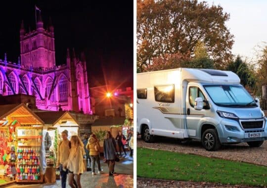 There’s a new Festive Period Special Offer from Bath Chew Valley Caravan Park in Bishop Sutton, North Somerset: Book three consecutive mid-week nights, touring or lodges, and save 10%. The offer is valid on stays up to 19 December, so you could visit both the Bristol German Christmas Market, (1 November – 23 December) and the Bath Christmas Market (28 November – 15 December) shown here with the winter sunshine on a fully serviced pitch.
