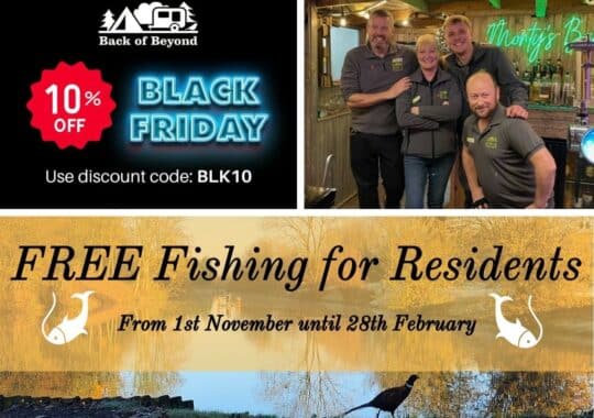 *Back of Beyond Black Friday offer T&Cs: Offer must be taken by 18/12/2024 on new bookings only. Strictly over 18s. Discount does not apply to dogs, welcome packs or any added extras. Glamping offer includes 2 x house drinks at Monty’s Bar to be given during Monty’s Bar normal opening hours plus 2 x morning pastries. Offer must be booked directly with our park either via our website or by calling the office. Offer is not valid via third-party websites. Minimum stays apply.