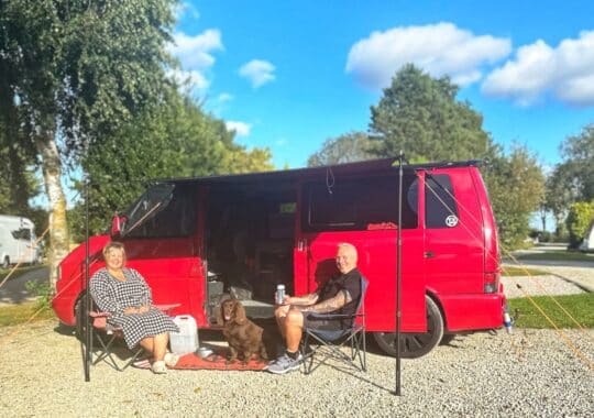 Overbrook is popular with campervanners. Here are a couple of guests relaxing in the autumn suunshine with their dog, Ozzie.