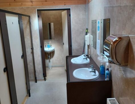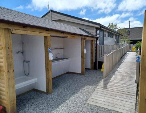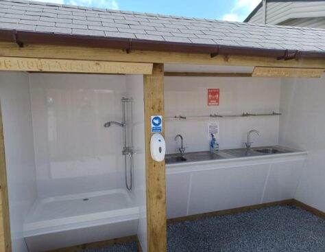 Washing-up and laundry room facilities are inside the heated building. There is also a new external extension to the shower block for 2021, which has additional washing-up facilities, a new bespoke chemical waste disposal and a dog/boot/wetsuit wash.