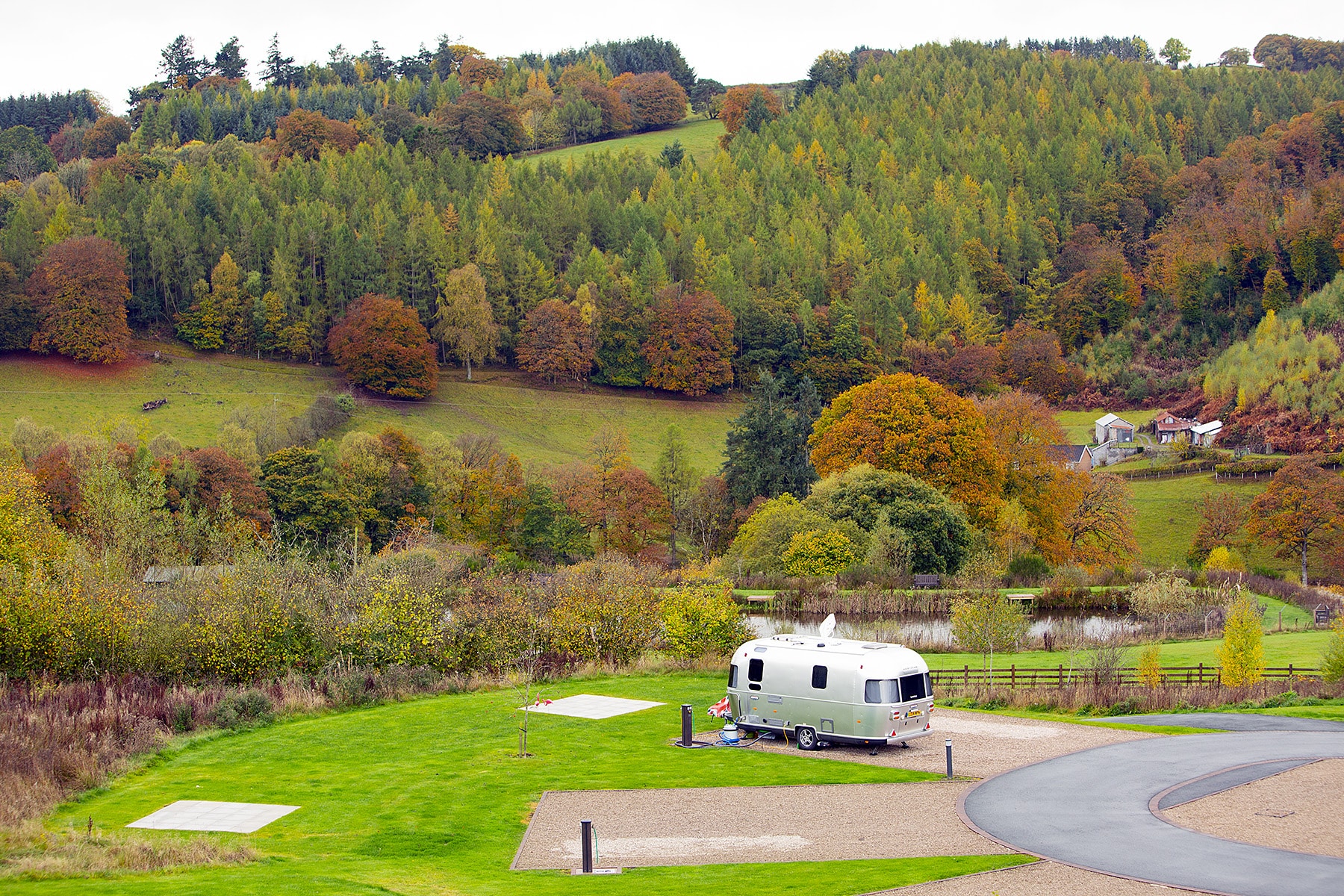 All pitches are gravel hardstanding, accessed along tarmac roadways with brick pavior edgings. Each pitch is fully serviced with its own bollard featuring: